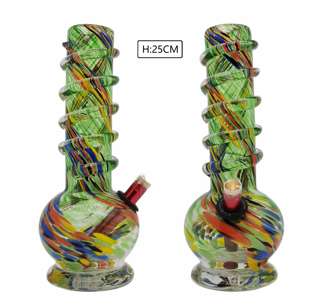 Discover the unique 25cm 3G Green n Rainbow Swirl Waterpipe, featuring an eye-catching swirl glass design and a durable brass cone for longevity. Each piece boasts a randomly colored stem, adding a personal touch to your smoking sessions. Ideal for those who appreciate artistry and smooth functionality in their waterpipes.