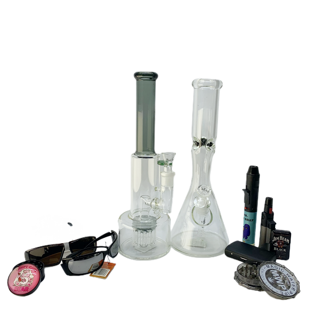 Step up your smoking game with the Double Filter & Beaker Bundle. This bundle includes the 34cm Stone Age Medium Glass Bong with a double black filter for smooth, clean hits and the 32cm Pinched Beaker Bong for a stylish yet functional experience. With three lighters, a plastic grinder, and a Care Bear pink metal grinder for perfect grinding, along with an elegant cigarette box, adult sunglasses, and all the essentials for a complete session, you’ll be set for any occasion.