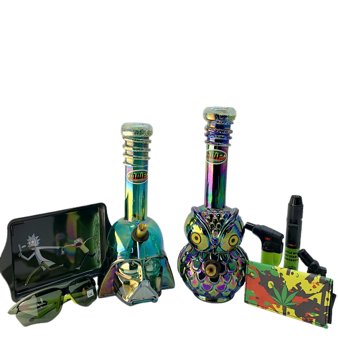 Elevate your sessions with the Night Watcher Owl & 3G Glass Bundle, a stunning mix of artistry and practicality. Featuring the mesmerizing Night Watcher Owl Bong (34cm) with its oil-slick rainbow finish and the classic MWP 3G Large Glass Bong (30cm), this bundle brings together unique design and reliable performance. Paired with premium accessories, it's perfect for enthusiasts who value both style and function.
