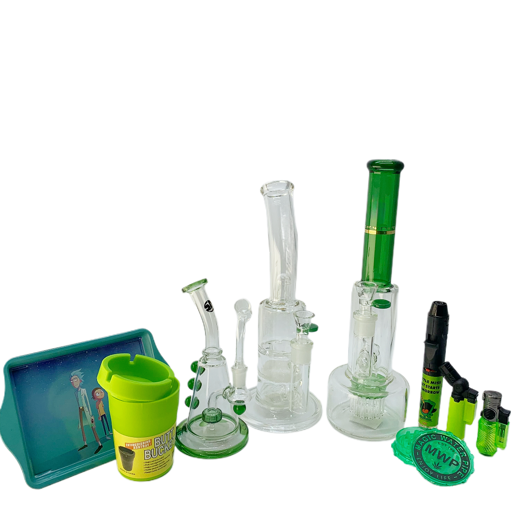 Elevate your smoking sessions with the Percolator & Matrix Rig Bundle. Featuring the 36cm Ice Bong with a 6-arm tree percolator for ultimate filtration, the Double Matrix Perc Rig (34cm) for smooth, cool hits, and the 20cm Stone Age Small Glass Bong with a green filter and handle for a compact yet powerful experience. The bundle also includes green-themed accessories like jet torch lighters, a plastic grinder, Cartiib Rikkubg rolling papers, and a butt bucket ashtray for a complete setup.