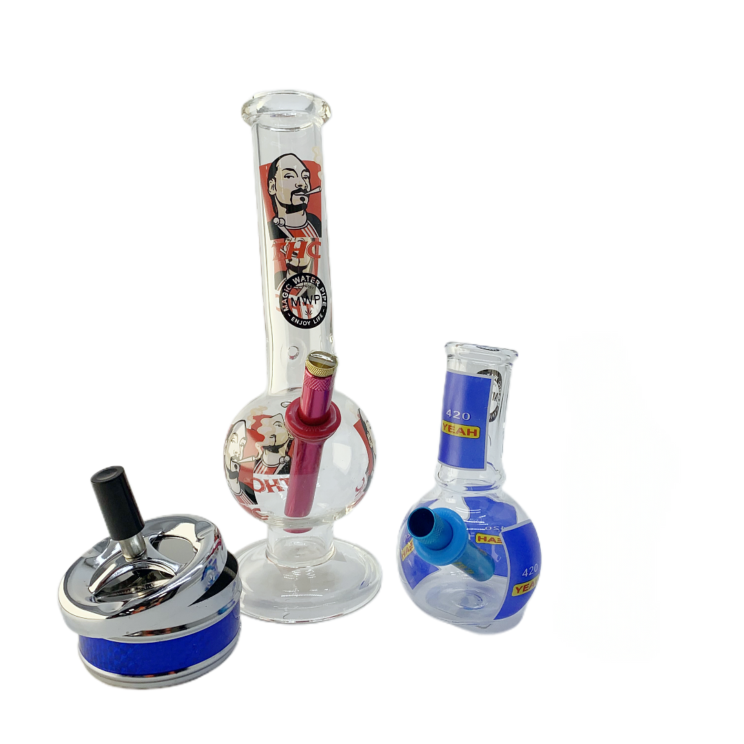 Elevate your smoking sessions with the THC Spinner Bong Bundle, a versatile set designed for both style and functionality. This bundle features two stunning bongs with unique 420 and THC-inspired designs, a stylish blue and silver spinner ashtray for convenience. Perfect for enthusiasts who love bold designs and practicality.