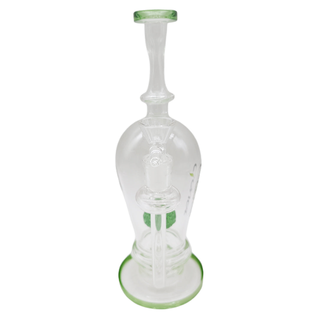 Crafted from thick borosilicate glass, this bong includes a fixed down stem and a 14mm glass cone, providing easy use and minimal maintenance. The flat, wide base ensures stability during use, while the flared green-accented mouthpiece adds a touch of modern flair. Its compact size makes it ideal for home use or portable enough to travel.