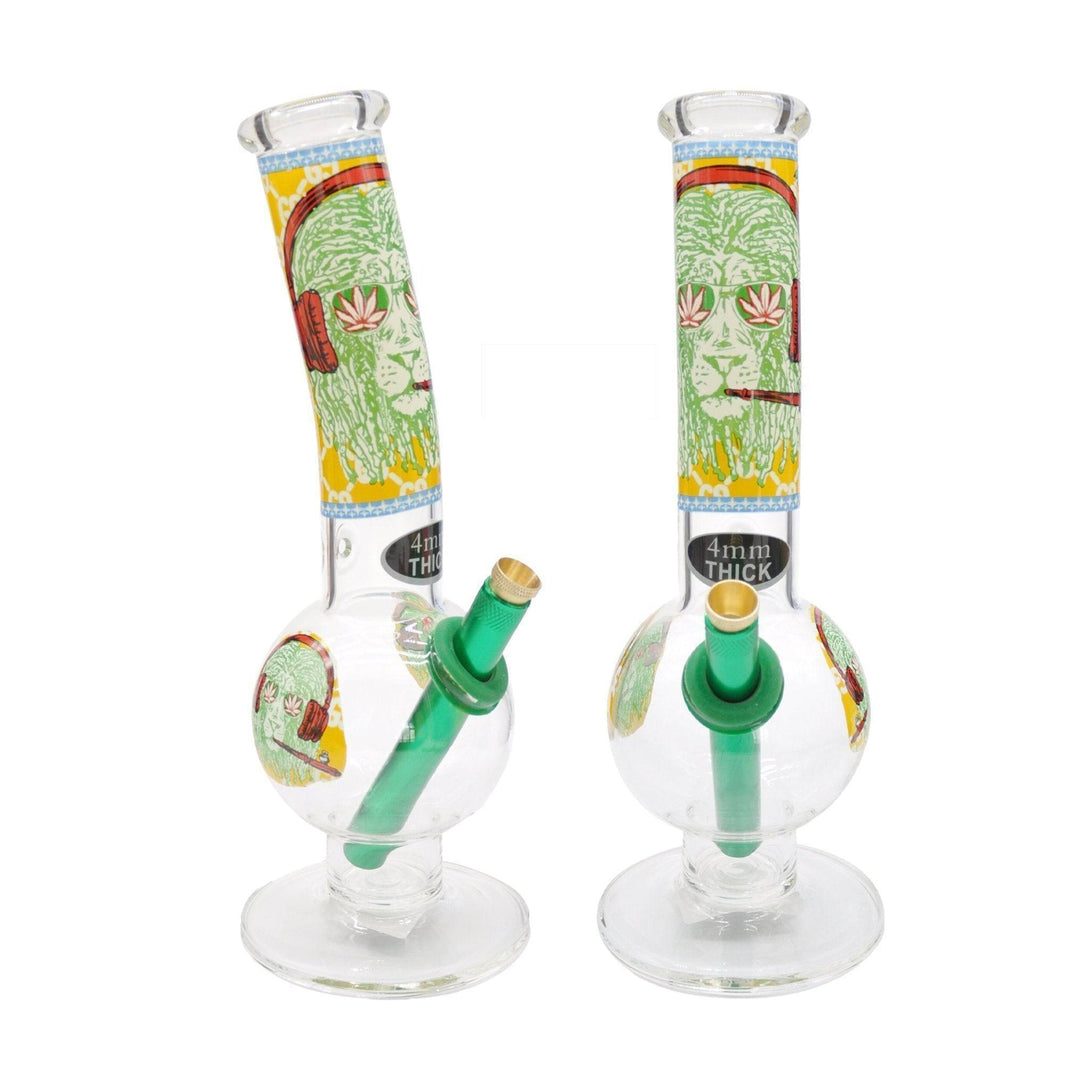 A solid glass bong standing at 28cm, The Bent Bubble Bonza Bong with Lion Print.