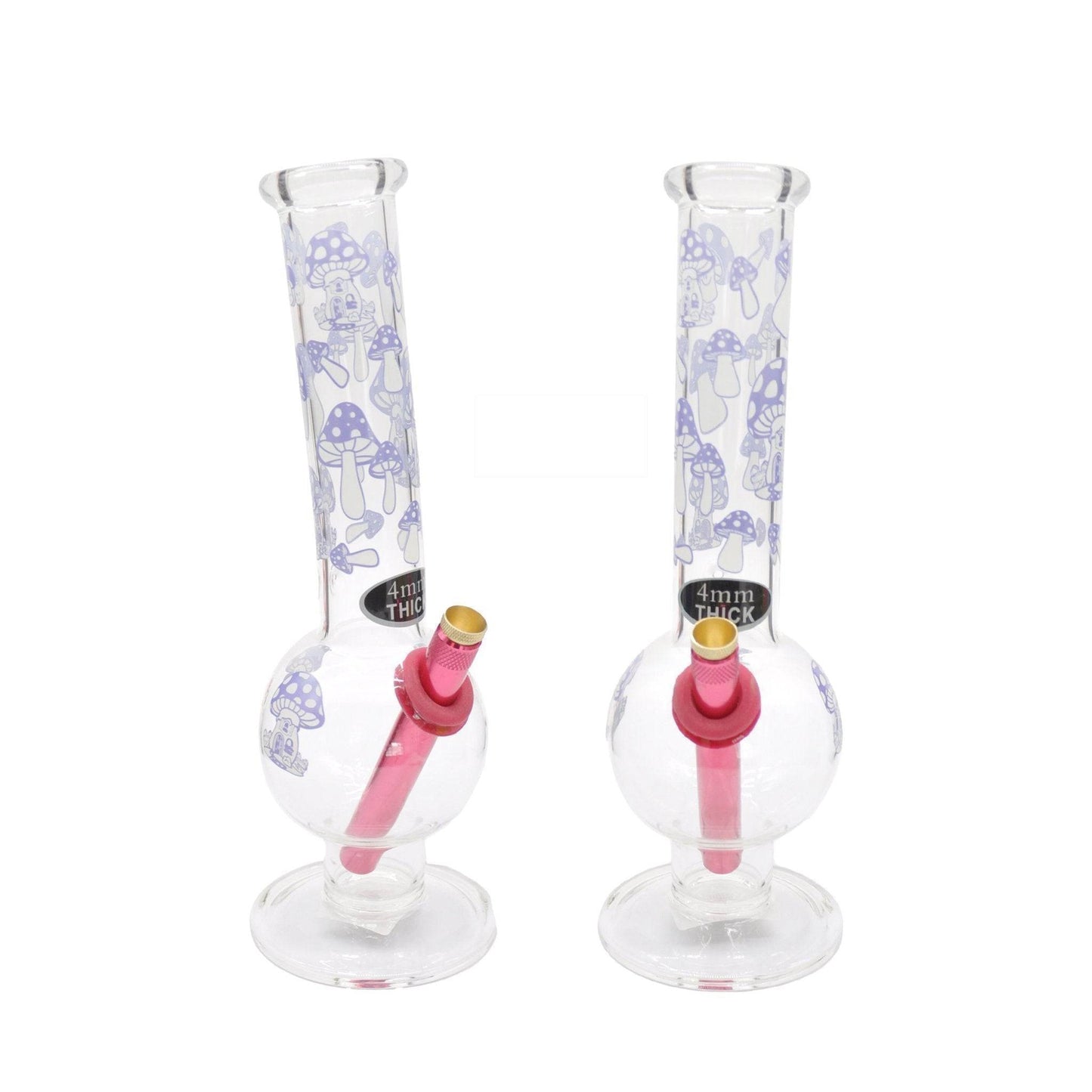 - Clear and translucent bong with printed Mushroom designs throughout the bong