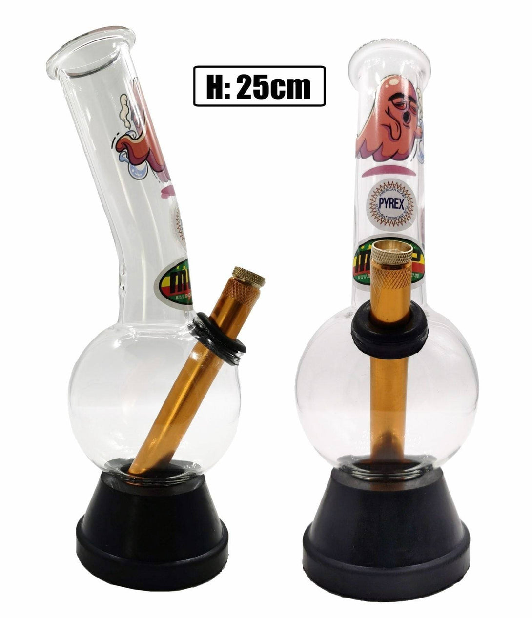 On offer is our MWP Medium Glass Bonza Bubble with Print Variations. Each waterpipe stands at 25cm and there are 9 print variations to choose from. Etched on the neck of each bong is a Comic-Like image. This could be either a Smoking Panda, Dope Skull, Bud-Man and 6 other options to choose. This Bonza Bubble Bong sits on a removable rubber base and comes with a randomly selected colored steam and brass cone. With both stem and cone being able to be removed for easy cleaning access.