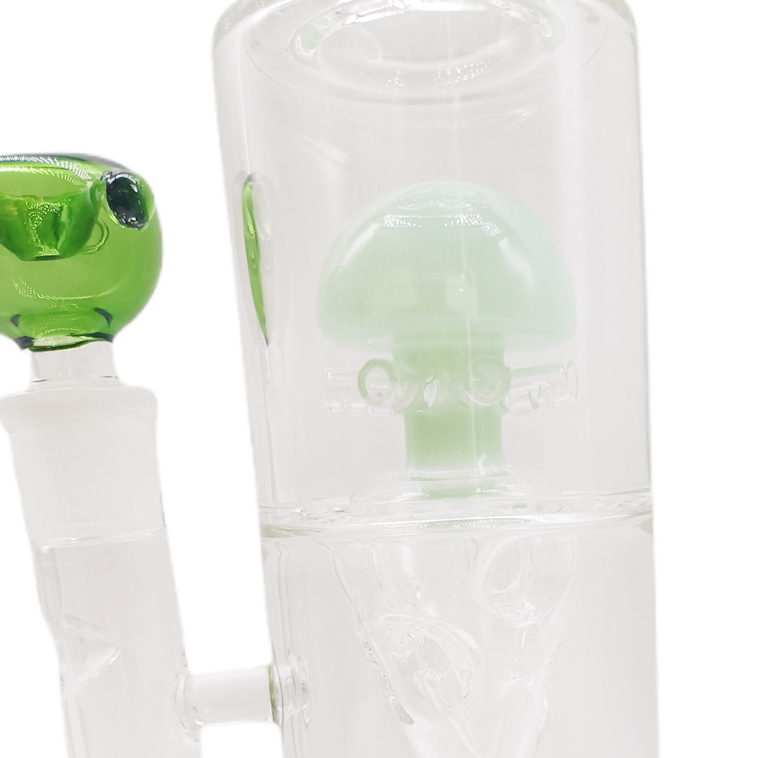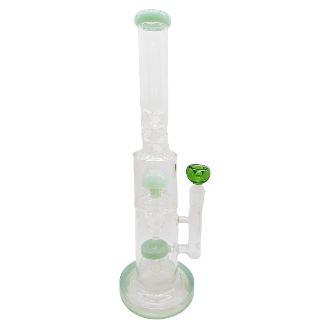 The Crystal Chill Double Percolator Glass Bong 46.5cm is designed for enthusiasts seeking both elegance and exceptional functionality. Standing at 46.5cm tall, this bong showcases dual percolators to maximize smoke filtration and cooling, delivering smooth, flavorful hits every time. Crafted from clear borosilicate glass, it features subtle yet sophisticated frosted accents on the percolators and mouthpiece that add a refined touch without overwhelming its clean look. The bright green bowl adds a vibrant contrast, giving the piece a fresh and modern appeal. Its straight tube design ensures a comfortable grip and straightforward use, while the broad, stable base provides steady support during every session. Equipped with a 19mm joint, it supports a variety of accessories to tailor your smoking experience. Perfect for daily use or as a centerpiece in any collection, this bong balances style, performance, and durability with every hit.