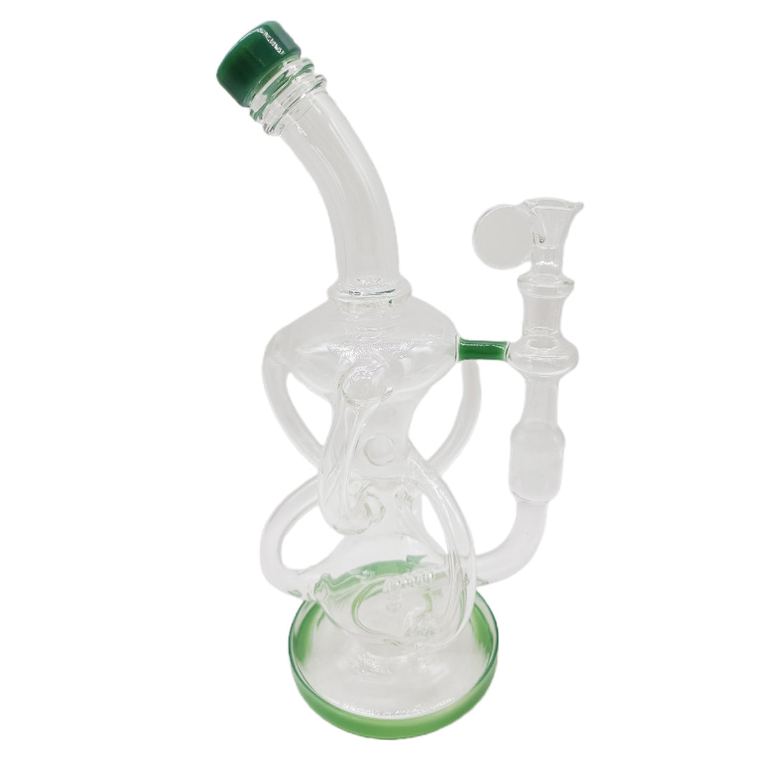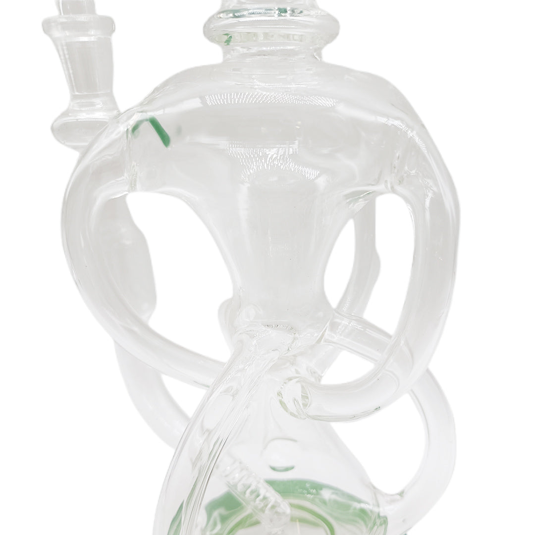 The Emerald Infinity Recycler Bong (30.5cm) is a mesmerizing blend of artful glasswork and advanced filtration. This piece features a sculptural infinity loop recycler system that continuously cycles smoke and water for ultra-smooth, flavorful hits with reduced harshness and zero splash back.