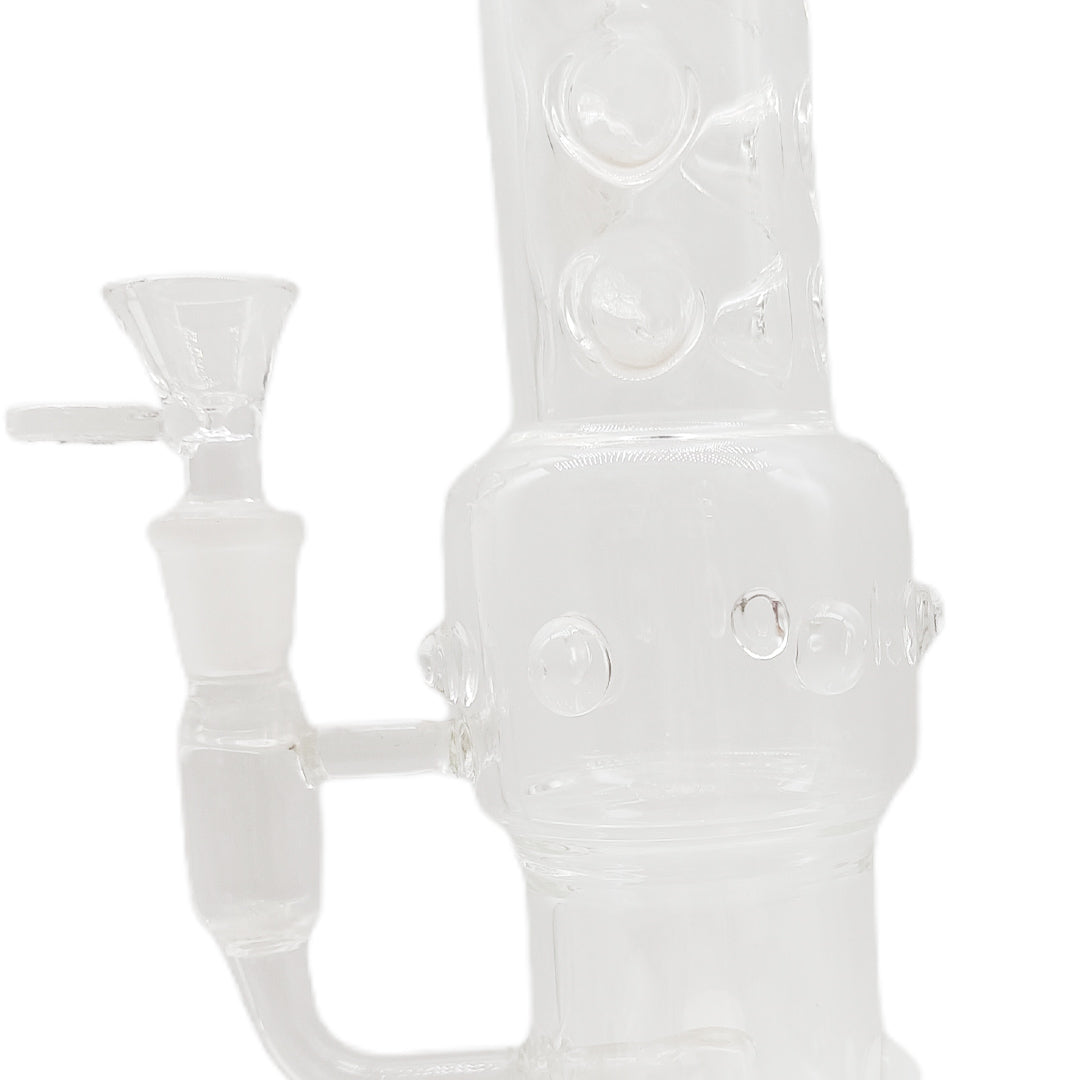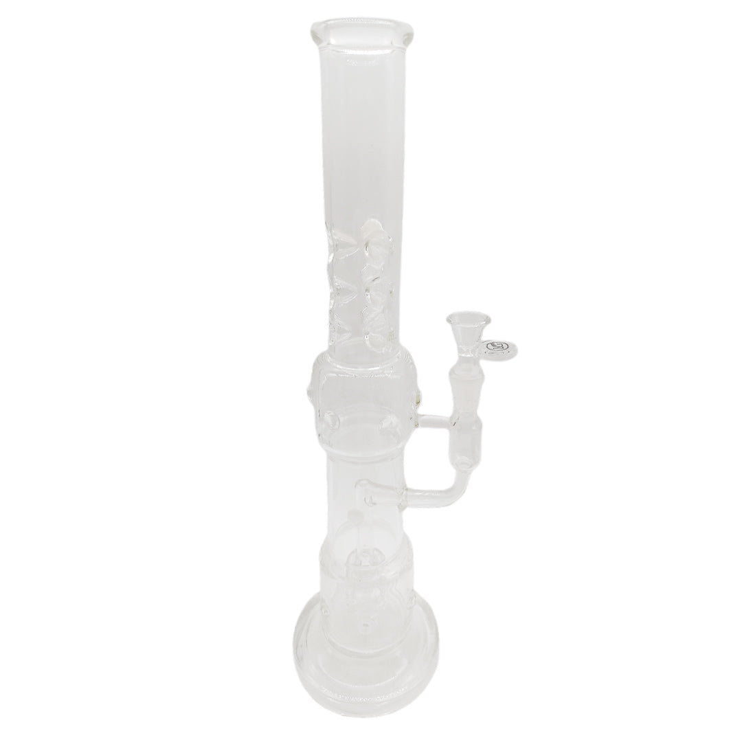 Made from high-grade clear borosilicate glass, this piece radiates minimalist elegance while offering durability and resistance to thermal shock. Its intricately structured percolators ensure excellent smoke filtration, producing cleaner, smoother hits every time. The straight tube design is complemented by a reinforced sidecar down stem and a wide, sturdy base that enhances balance and safety during use.