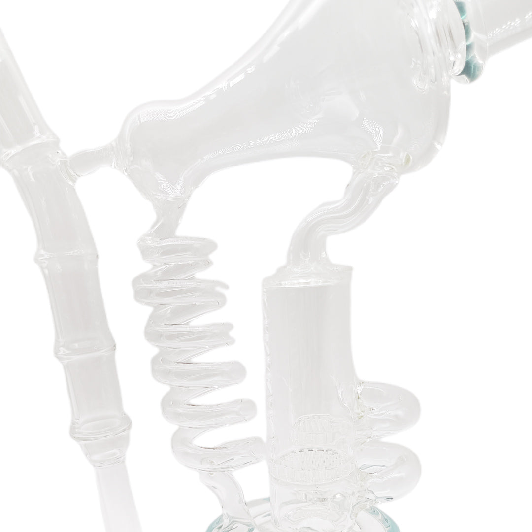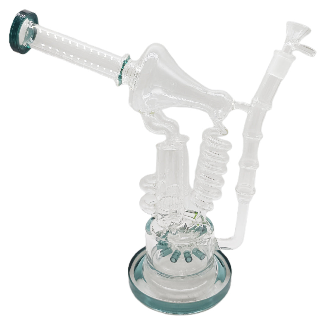 Expertly crafted from thick, lab-grade borosilicate glass, the bong features elegant teal accents on the base, mouthpiece, and inline perc. The precision-engineered inline percolator at the base provides powerful diffusion, breaking down smoke into fine bubbles for cooler, cleaner hits, while the spiraling recycler tubes rapidly cycle water and smoke through the chamber for enhanced flavor and smoother inhales.