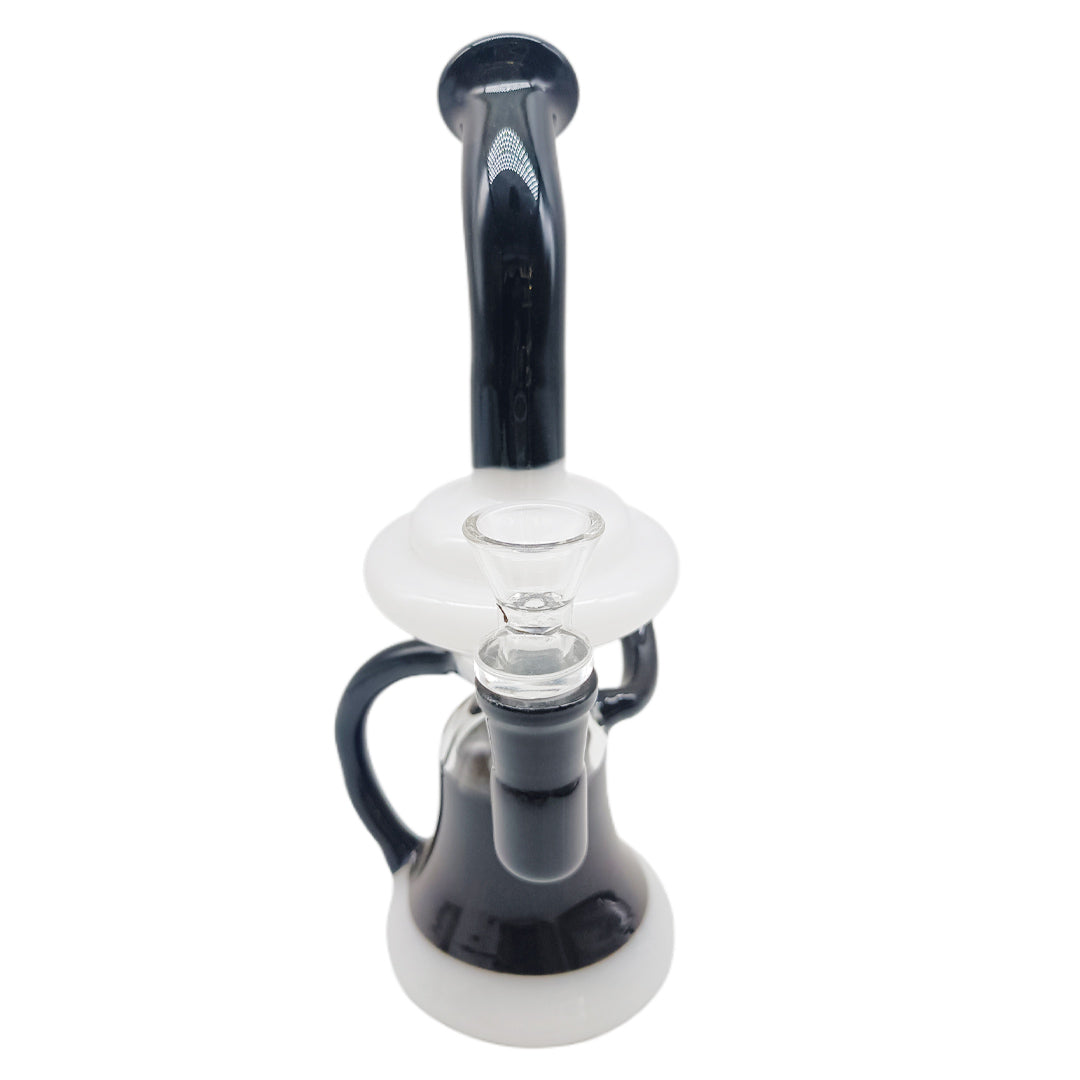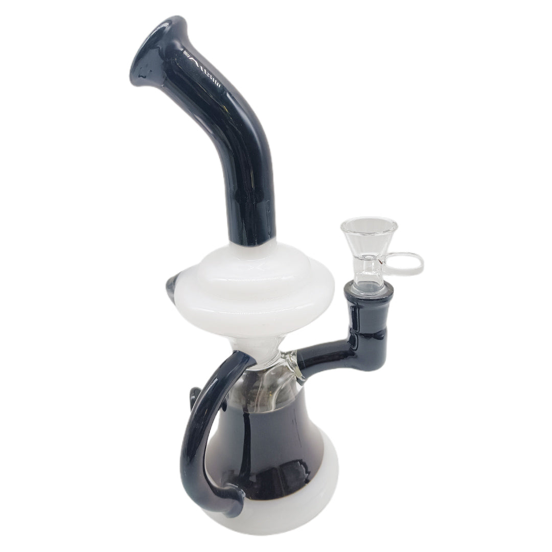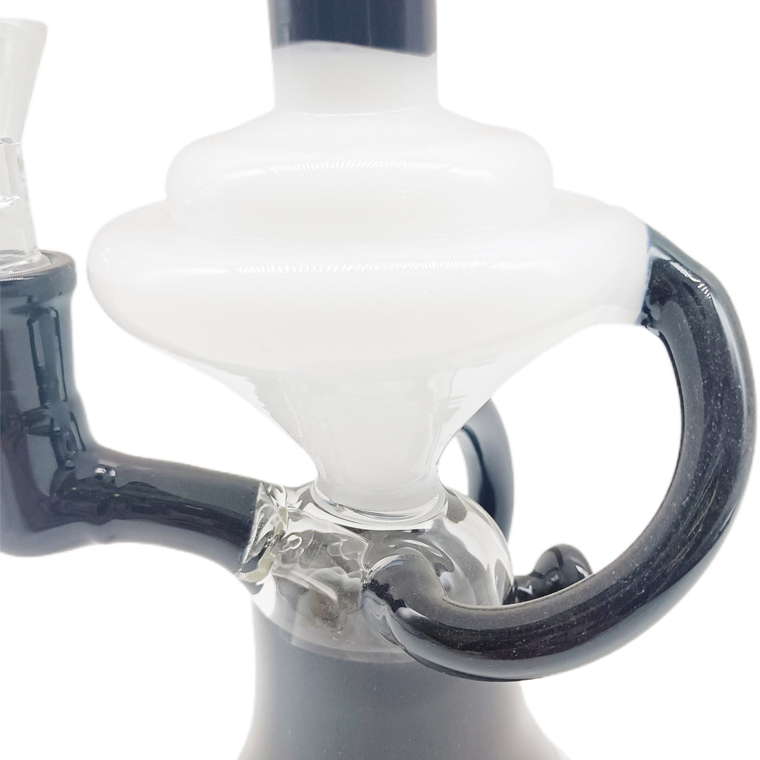 The Obsidian Spiral Recycler Bong (26.5cm) is where form meets function in a dramatic silhouette. With deep black and crisp white glass tones, this piece delivers bold contrast and a futuristic feel — perfect for users who want a unique look without sacrificing performance.